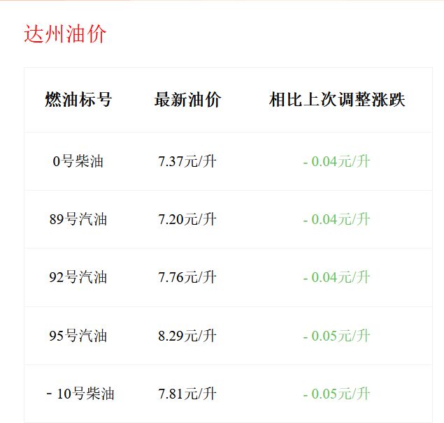 达州0号柴油为价格7.41元/升,上调了0.16元/升
