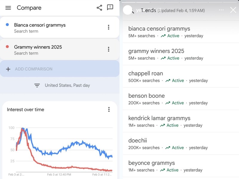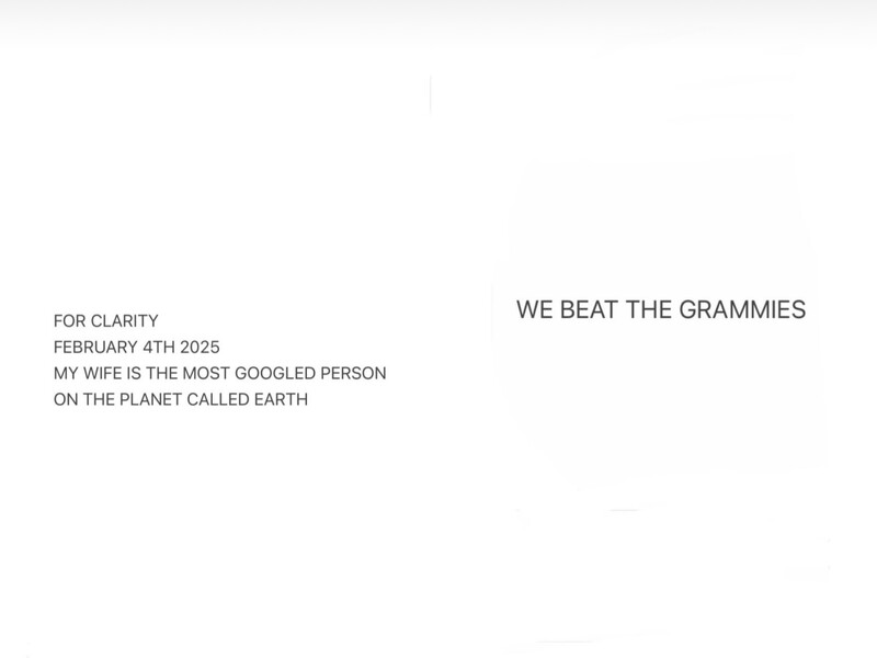 葛莱美红毯过后,肯爷在个人Instagram上连续分享了许多则限时动态,先是晒出了google数据表示妻子Bianca Censori是当天搜寻量最高的名人,甚至超越葛莱美奖本身,更表示,展现夫妻挡的超高话题度。