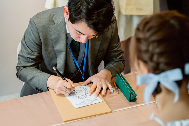 在日本拥有超高人气的K.UNO,不只吸引新人客製婚戒、情人对戒,想为自己打造独一无二饰品风格的消费者,也相当倚重K.UNO珠宝设计师的专业建议。K.UNO的品牌精神在于——,因此是品牌一路以来相当坚持的目标。发表会这天,K.UNO也特别安排珠宝设计师野田先生亲自为Nina手绘专属戒指,没想到在短短10分钟内,野田先生就在画纸上勾勒出以Nina最爱的白雪公主为灵感的设计钻戒,戒指细节还包括Nina的名字,甚至苹果被咬一口的意象也被细心放入,让在场所有围观的受邀嘉宾都透出跃跃欲试的心动!
