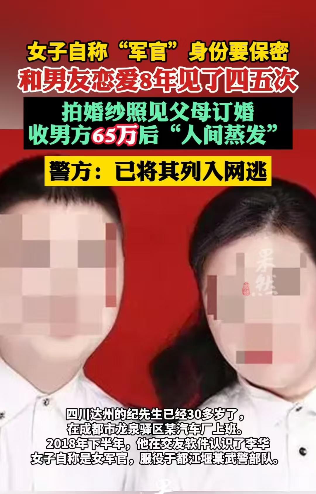 四川达州,八年里,“军官女友”从不许男子发自己照片,说这是保密规定。男子信了,哪怕只见过四五次面,仍陪着拍婚纱、装婚房,直到65万转完,人彻底消失,他才惊觉:所谓的“保家卫国”,全是骗他的戏码。